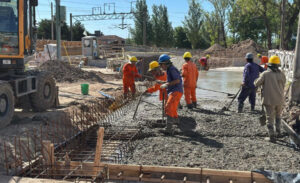 Actualmente se está avanzando tanto del lado Este, como del Oeste, con tareas hidráulicas, la armadura de los muros debajo del puente carretero y de los tabiques internos donde se apoyarán los pisos para el paso nivel peatonal y también con el desmonte y la colocación del intertrabado, entre otros frentes.